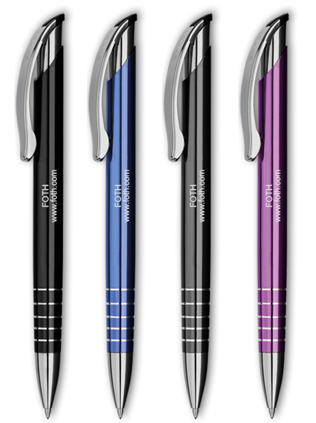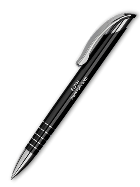 This aluminium pen has a shiny finish with 5 etched rings at the tip. The chrome accents on the tip and plunger give it a striking look, while the large, sweeping clip adds a touch of elegance. The long, wide barrel provides the perfect backdrop for your company name or unique message.